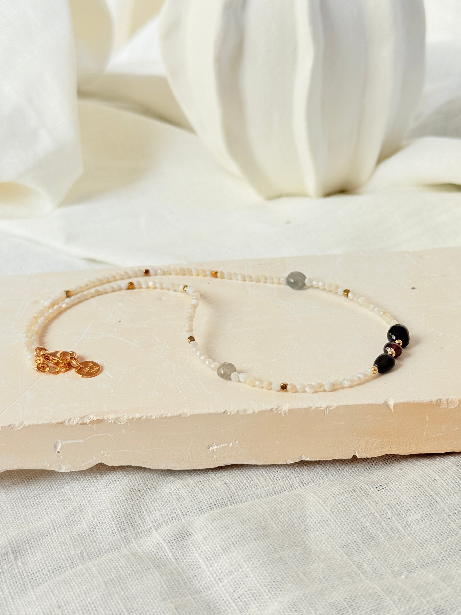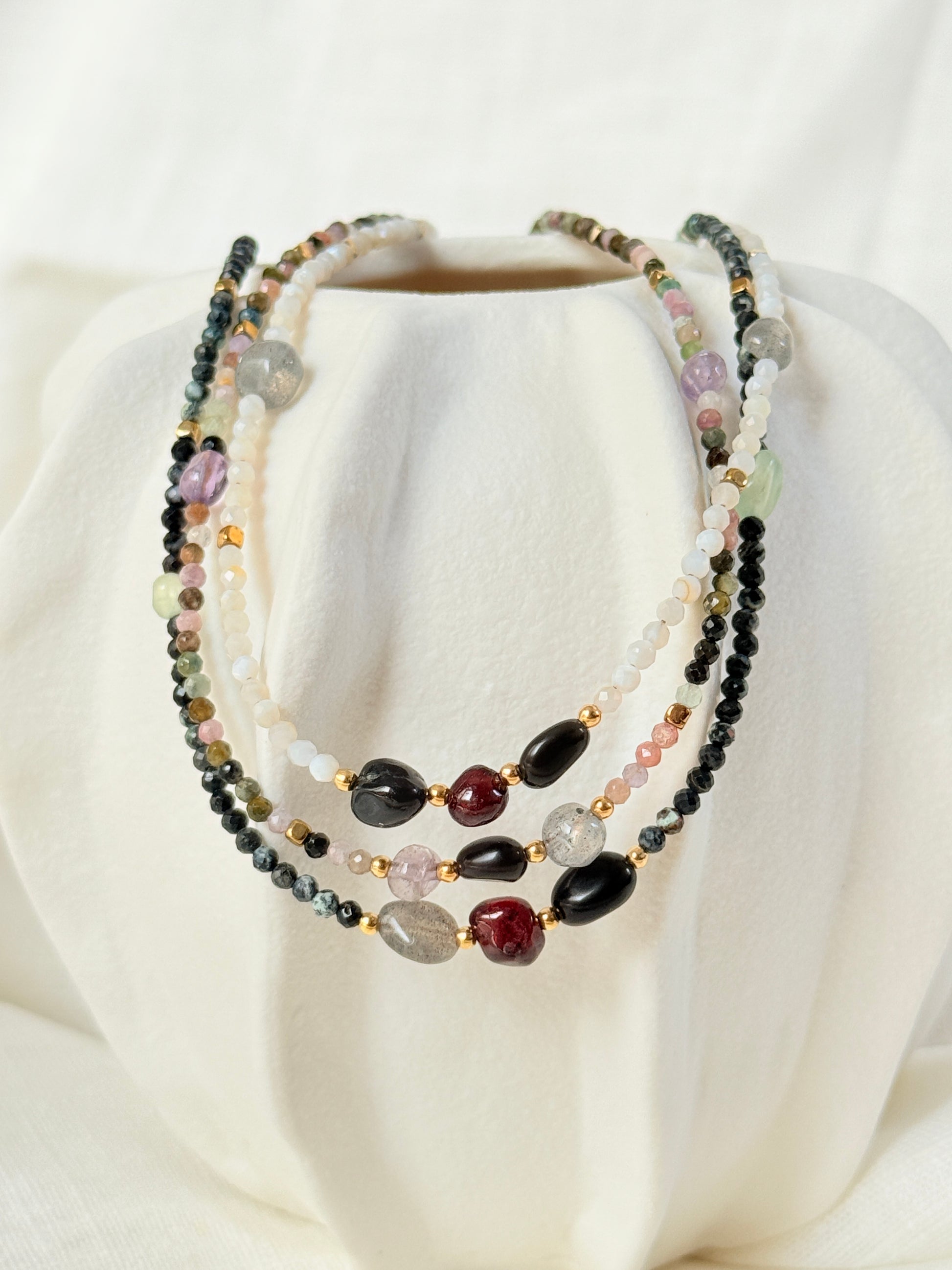 Nouveauté pour le collier Brigitte entièrement composé de pierre fines naturelle de différentes forme et de perles plaqué or