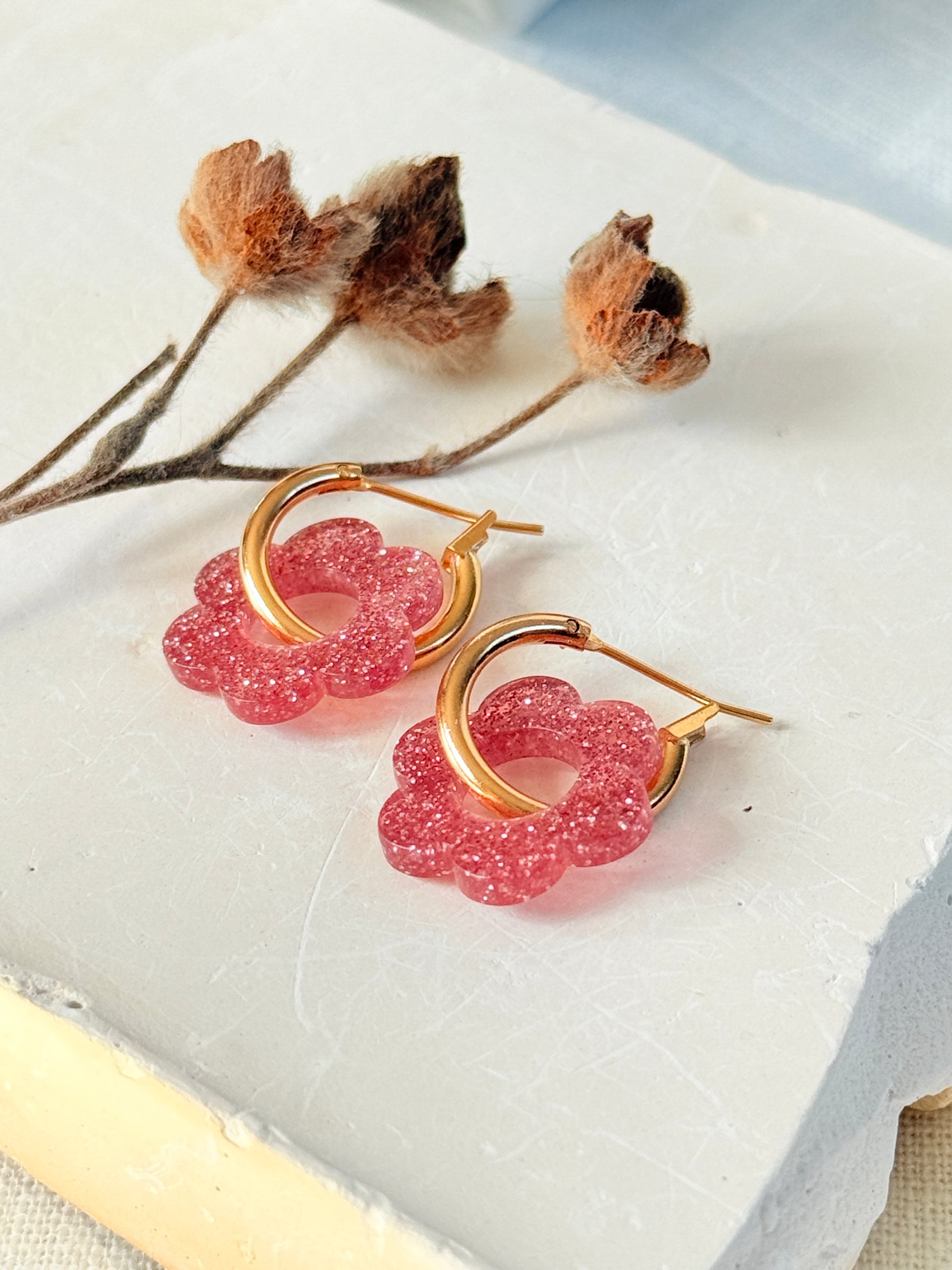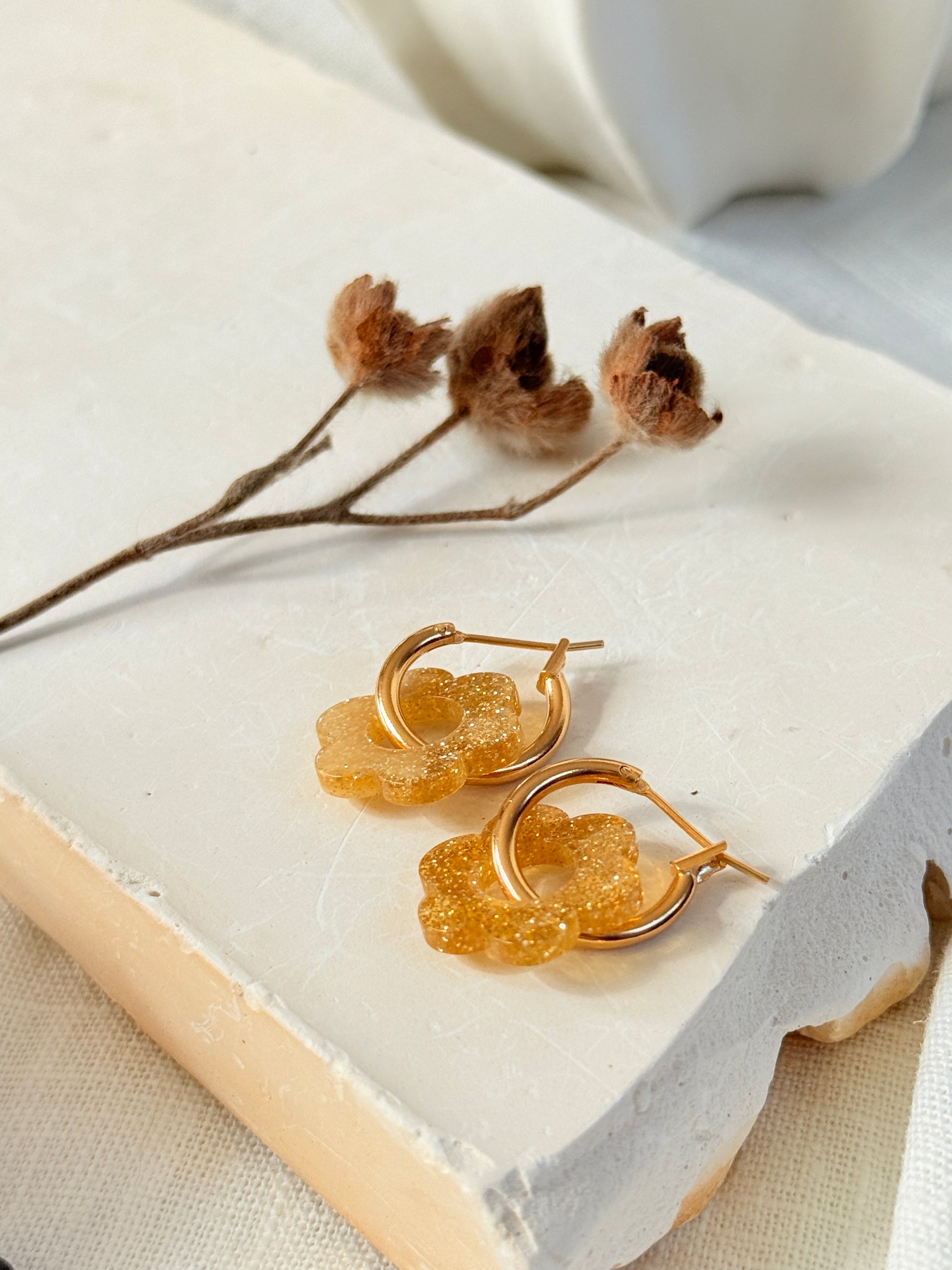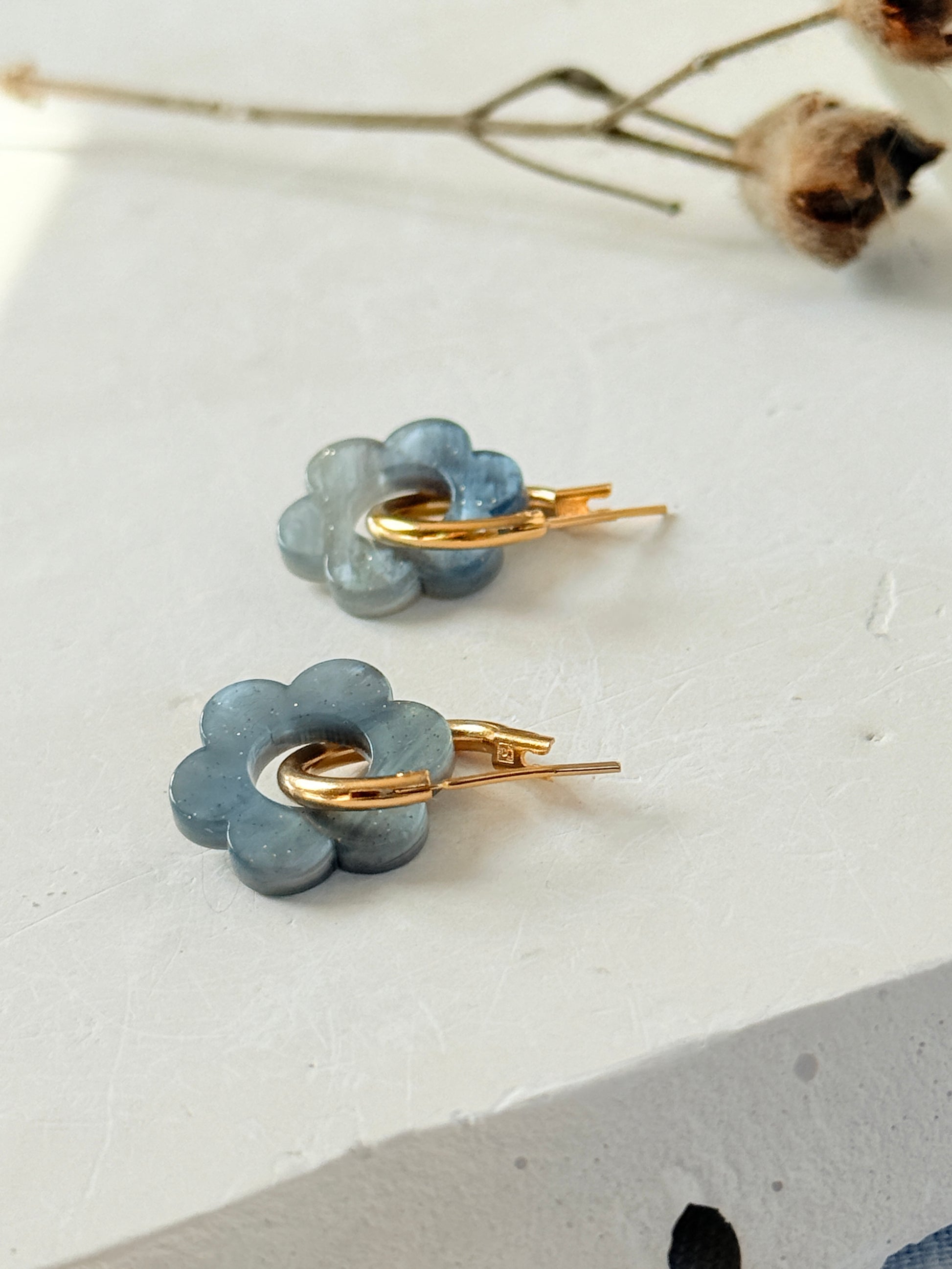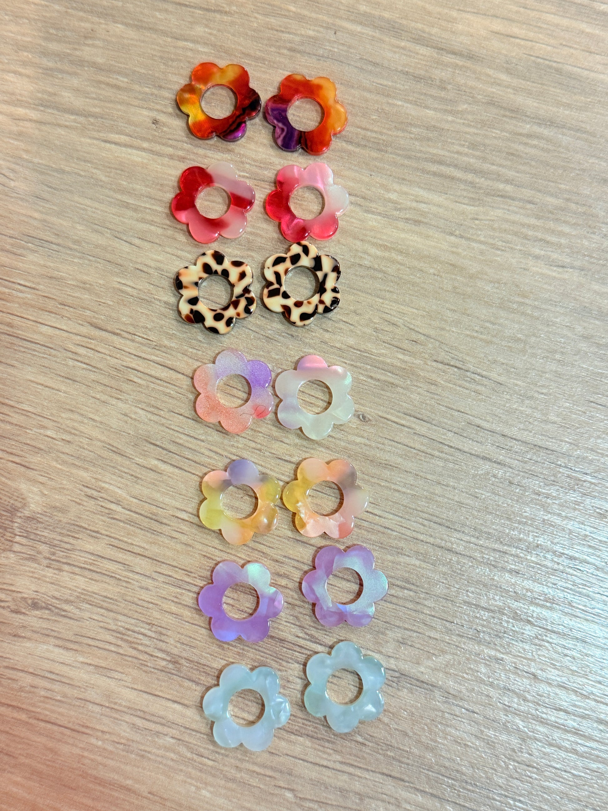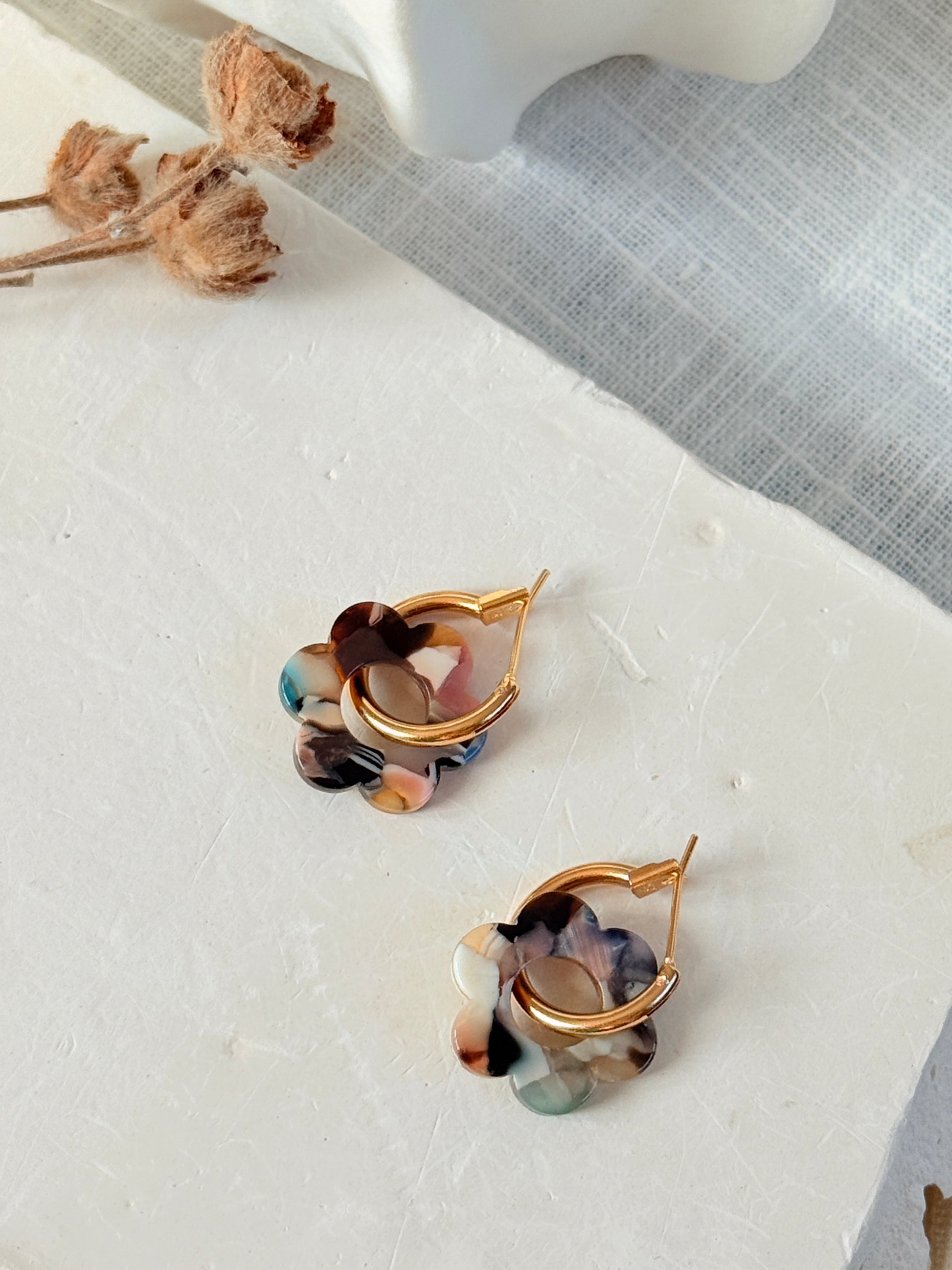 Les boucles d'oreilles FLORE sont devenues vos coup de cœur! Créoles en plaqué or et fleur en acétate. Existe en plusieurs version